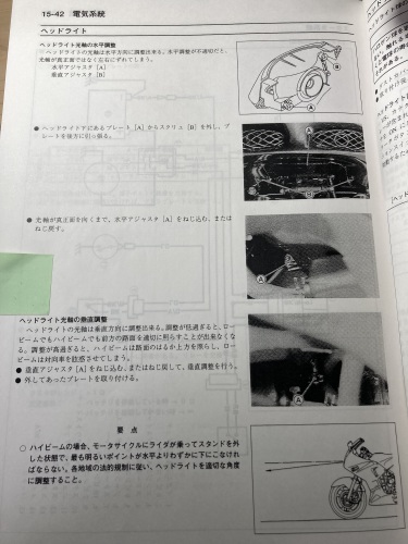 作業はT工場長に頼めば早いのだが、出来れば光軸くらい自分で調整したい。サービスマニュアルを確認、フロントカウル内〜ライト横のネジ2本で上下/左右の光軸調整が出来るようだ。垂直側はネジに小さなギアが組み込まれていて、つまみを廻せばネジが廻る構造になっている。仕組みは理解できた。後は整備性の悪いZX-11、実車でサービスマニュアル記載のネジを見つけられるか?