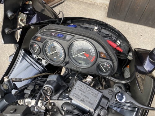 ケロとのマーブルビーチ朝駆帰着後、インナーカウルとスピードメーターを外してみる。上から覗き込んで、サービスマニュアル通りにライトの右上に光軸調整用つまみがあった(トップの写真)。ところが実際に回してみると硬い。なんとか廻せるようにしたものの、どちらに廻せばよいか判らない。天頂に向かって時計廻りに10回転廻してみたがヘッドライトの上下照射に変化が判らなかった。この日はこれでギブアップ。