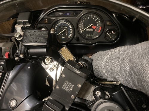 3) カウルの隙間から右手を逆シングルの形で突っ込む(↑写真)