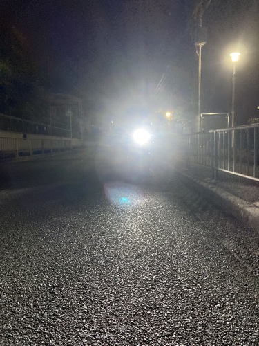 早速試運転。歩行者の目線が左の写真。これでも充分に明るいが直接目に入る眩しさはだいぶ回避出来ている。iphoneを路面近くまで下げると眩しくなった。