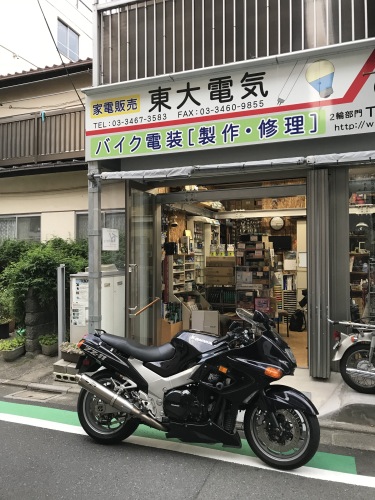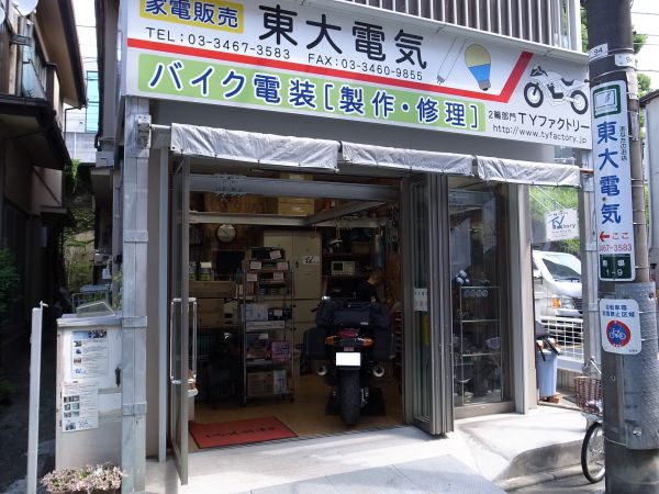 事前にgoogleマップで予習したにも係らず、首都高渋谷ICを下りて近くまで来てからは、それこそひたすらナビ頼り。細く入り組んだ道を抜けて、昔ながらの商店街の一角にTYファクトリーはあった。外観は普通の街の電気屋さん。中に入るとバイク1台がやっと入る程の作業スペース。但し工具等は整然と備えられていた。