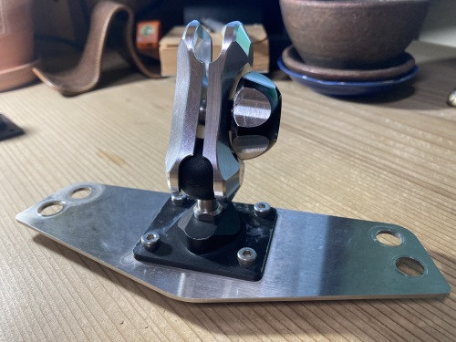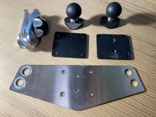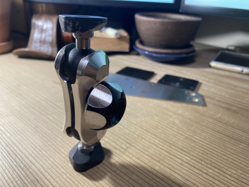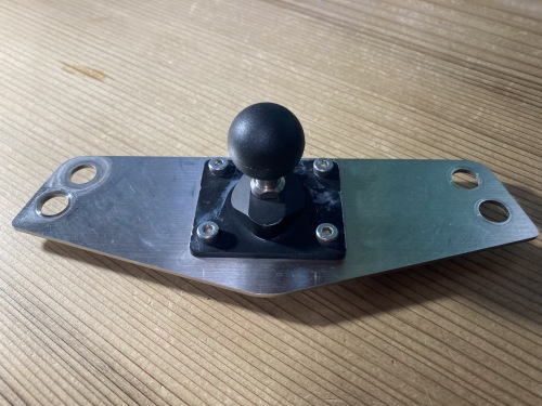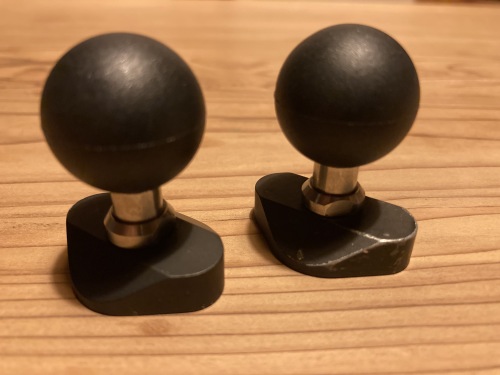ここまで取り外すのは装着時以来12年振り。真ん中のトップブリッジは完全オリジナルのワンオフ品。ミミオ設計!〜きりいたcom.に製作して貰ったもの。これにサインハウスのA-15ベース2個とB-7アームを組み合わせてマウントシステムになっている。左端2個のボール部。補修テープで体積を大きくする事で対処しようとしたが、ナビの質量と振動には結果的に耐えられなかった。A-15ベースの2個はサインハウスに発送。