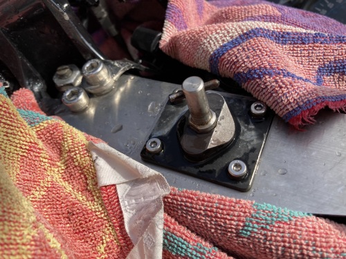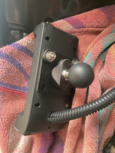 車検整備前からボール劣化は確認していて、いずれナビ保持が出来なくなる事は想定。そこで車検整備の間にサインハウスのサポートセンターに問合せしてみたら、現物のA-15パーツを送付すればボール部のみを交換修理可能なのは判っていた。それがこんなに早く起こるとは思わなかったが、帰宅後、パーツがカウルの隙間に落ちるとやっかいなのでミミ坊に手伝って貰ってマウントシステムを取り外す。