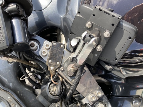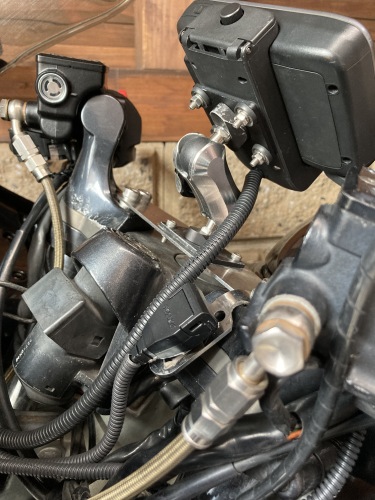 マウントシステムとナビ本体 + クレードルを連結して無事装着完了。ハンドル中央に画面がいくように微妙に位置合わせをする