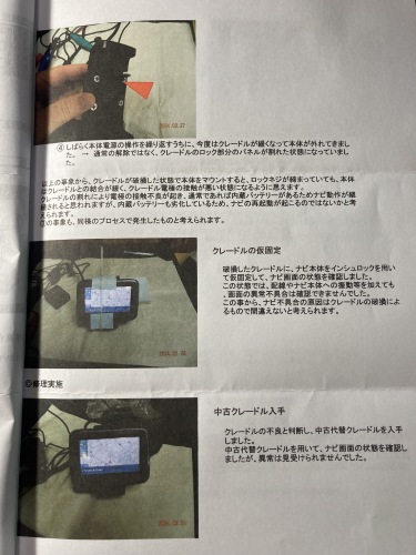 到着後の動作確認。配線の外的要因では症状再現できず。クレードルを外そうとしたところうまくいかず、何度か試みる中で破損したとの事。元々取り外しがとても渋くて、本体はほぼつけっぱなしにしていたので仕方が無い。この段階でTYファクトリーから連絡があり「電源不安定なのはクレードルが要因と思われる。クレードルの中古入手で対応可と思われる」との事。