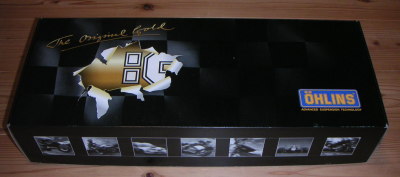 数日後、待望のオーリンズリアサスが到着!なんだかとっても格好良い箱。