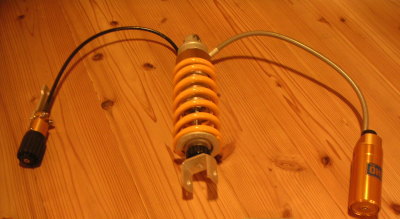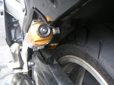リザーバタンクの取付はこんな感じ。リザーバタンクの向きは通常の取付と異なり180°反転させている。市販のタンクステーを流用している関係で、理想の位置よりは若干低いが、ほぼ私の希望通りになった。限られた条件の中、通常のオーリンズ交換工賃でここまでやってくれたT工場長に感謝!。車体の奥に黄色バネが微かに見える。 | |
