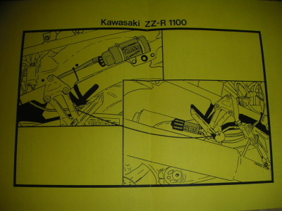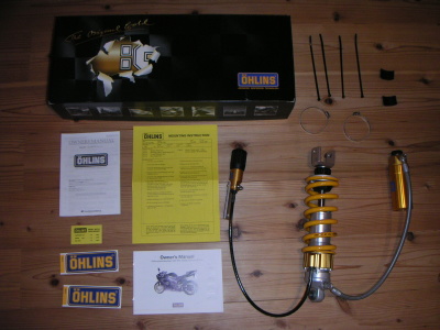 カロッツェリアの作業は1日で終わり、数日で我が家に戻ってきた。最初の写真と違ってリザーバタンクが180°反転されている。同封されているものは、サスペンション本体、取扱説明書(英語版と日本語版、そしてZZ-R1100専用のセッティング説明書の3冊)、ステッカー、チューニングメモ用シール、取付用バンド。