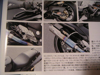 あれこれ、我が家にある雑誌を片っ端から眺めて廻ったが、なかなかピンとくるものがない。う〜ん。やっぱり導入見送ろうかな・・・。と思っていた矢先にHyperBike誌に紹介されている1台のZZ-R1100が目に留まる。某有名ショップが製作したカスタムマシン。マフラー交換等はしているものの、カラーリング等純正のスタイルを極力維持している。そしてオーリンズのリザーバタンクが、他のカスタムマシンと違ってタンデムステップ端に綺麗に納まっている。ZZR1400のアシストグリップのように、まるで最初からそこにあったかのよう。「これだ!」という訳で、このスタイルを理想として色々調べてみた。