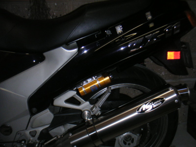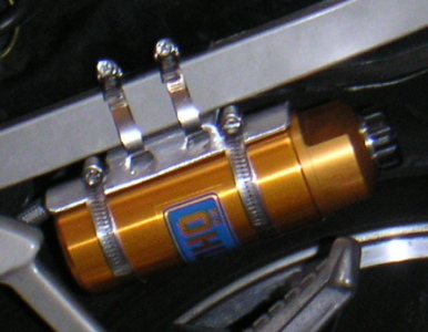 オーリンズのリアサスも無事導入。懸案のリザーバタンク取りつけは赤男爵店・T工場長ご尽力で、ノーマルのスタイルをあまり崩す事なく、左右対称の位置に無事取り付ける事ができた。これで充分満足だったが、欲を言えばリザーバタンクステーの取りつけ高さが若干私が思っていたよりも低いのが気になる。もともとは市販のリザーバタンクステーを流用してT工場長がうまく加工して取り付けてくれた。これ以上は切断と再溶接が必要で、簡単にはいかない。改良と言えどもここから先はワンオフの世界になってくる。