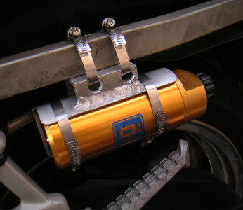 左が加工前。右が加工後。ギリギリまでステーの高さを低くして貰ったので、相対的にタンクの取り付けが1cm弱高くなった。ついでにタンデムステップステーとの距離も空いていたものを詰めた。サスとリザーバタンクを繋いでいるメッシュホースは長さピッタリ。これならばタイヤとも干渉する事はない。世界にひとつしかない”スギ印・ZZ-R1100リザーバタンクステー改”。スギさんありがとうございました!!