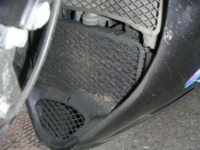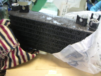 1週間後、作業を終えたZX-11を引き取りにいく。取り外したドロドロのオイルクーラー(←の写真)。