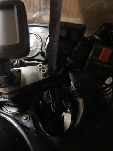 トップブリッジ留めているネジに共締めすれば、良い感じでつきそうだ。但し今のバイクナビがこのままだとスマホと干渉しそうだ。実際に装着した後にポジション調整は必須だが、取付位置の目途は立った。