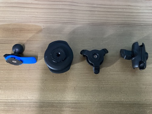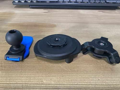 左からスマホ側のRAM・MOUNTS用ボールアダプター、ワイヤレス充電ヘッド、バイク用振動吸収ダンパー、RAM・MOUNTショートアーム。ボールアダプターの脱着システムはは充電ヘッドに置き換えるので、私が欲しかったのはボール部分だけだったのだが、色々探したものの他に適合するパーツが無かった。