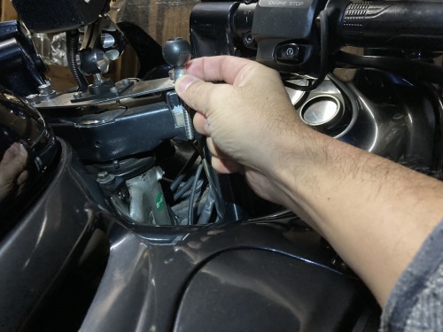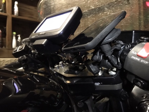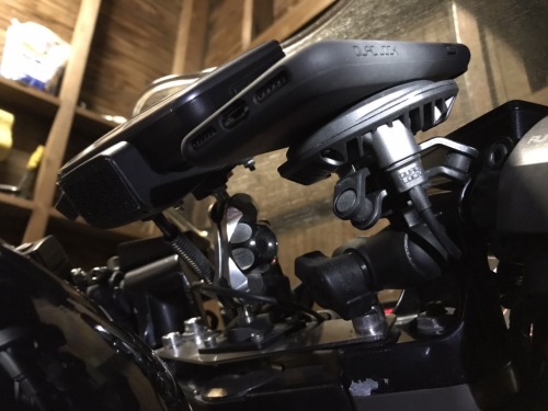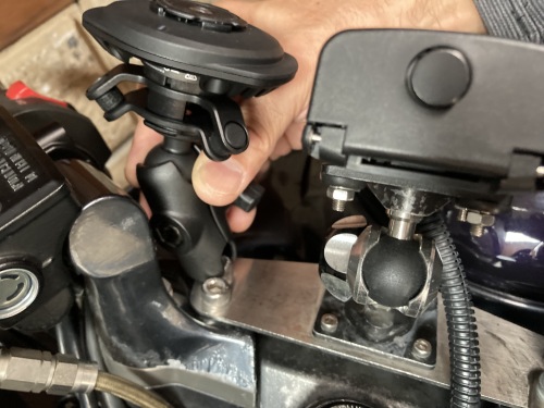 手前側と奥側とポジションがなかなか決まらなくて何度か付け替えて実機合わせ。結局奥側にベースをつけて、アームを目一杯右に振り、更にバイク・ナビ側のアームを目一杯手前に伸ばして干渉を避けて、ようやくポジションが落ち着いた。