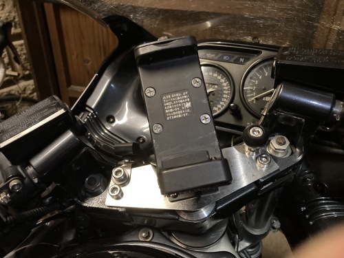 スマホ・ナビシステムを構成するパーツ一式。ひとつひとつのパーツはそれ程ではないのだが、積み上げていくとシステム全体としては結構なお値段になる。それとパーツの組合せが多いのは有り難いが選択が難しい。ZX-11はトップブリッジの一番いい場所にはバイクナビを設置している。それを動かす事は考えていないので、必然的に設置できる場所はピンポイントで限られる。