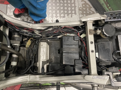 タンク下の配線経路を見せて貰う。タンク下の狭いスペースに所狭しと配線がはっている。