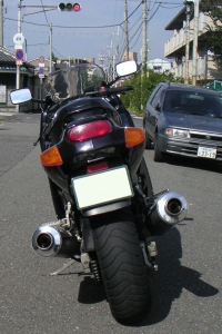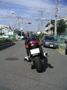 サイドスタンド交換作業前。 信号の角度に比べてZX−11が極端に寝ているのが判る。 ZZ−R1100を数多く見てきたアウトリズムのB氏、S氏共「ここまでサイドスタンドが寝ているのはあまり見た事が無い、との事。 |