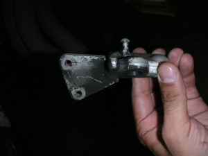 作業後取り外されたサイドスタンドブラケット。サイドスタンドとの接続部が少し曲がっていた。 アウトリズムS氏の話ではブラケットを新品に替えた後、試しに今までついていたサイドスタンドをはめてみたら角度はかなり改善されていたらしい。私のZX−11が極端に寝ていたのはこのブラケットが一番の原因だったようだ。 このブラケットがやっかいなのは、交換するにはマフラーを外さなければならない事。ノーマルのマフラーを外す為にはもちろんアンダーカウルも外さなければならないので結構な作業になる。 |