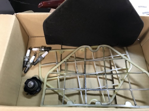 今回交換した部品一式。プラグ4本、ラジエターキャップ、エアクリーナー。これにリアアクスルシャフトが入る。 |