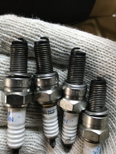 プラグ。4本の焼き加減は微妙に差があったが、見た感じは焼けすぎも、かぶった状態も見られず、状態は悪くないように感じた。 実際もうすぐ累積距離10万kmに達するがエンジン自体の不調は今まで一度も無かった。特にここ数年は状態が良い。 |