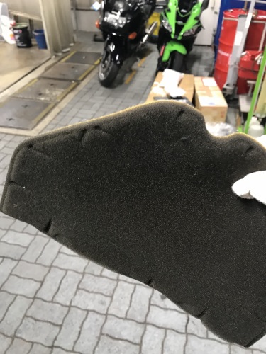 エアクリーナー。スポンジがポロポロ分解するような状態では無かったが、プラスチックのフレームが一部湾曲して隙間が空いていた状態だったそうで、併せて交換。 |