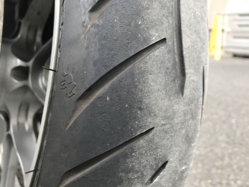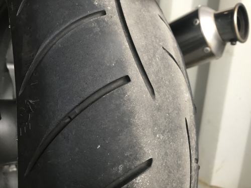 安定した乗り味が気に入って、3サイクル乗り継いだメッツェラーZ8。2年前の車検に交換して15,000km走ったリアタイヤ。象さん位置を観てみても、スリップサインが出てくる気配も無い。この感じだとあと 5,000kmは余裕でいけそうな感じがする。