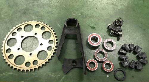 今回の交換部品。結果的に今回は駆動系のリフレッシュが主となった。左からリアスプロケット、チェーンスライダー、ホイールベアリング、ホイールダンパー、クラッチレリーズ。
