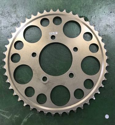 アルミスプロケット。耐久性を心配していたが、5年・28,000km走ってくれた。それでもまだ即交換、という程では無い。T工場長、「アルミスプロケットでこれだけ持ったのは、私が知る限り新記録です」との事。砂が噛むとアルミスプロケットは一気に摩耗が進むらしい。ツーリングから戻る度に軽く洗車、チェーンはウェスで拭いて給油している。それがチェーンとスプロケットの寿命に貢献している事が判って、素直に嬉しい。調子が良い46Tを変わらず選択(純正は43Tか44T)。