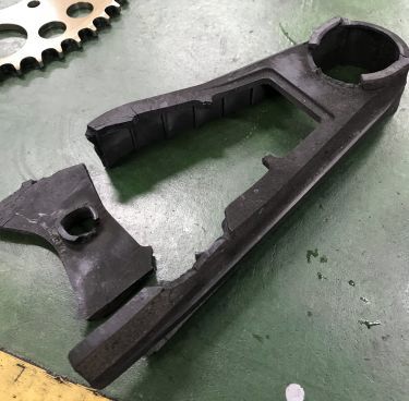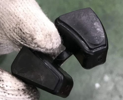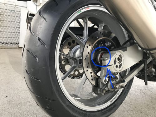 こちらも予定外の交換部品、チェーンスライダー。スイングアーム部に装着されている樹脂製品。チェーン接触からスイングアームを保護する為に装着されているが、片側が欠落している。チェーンが当たって、というよりは経年劣化が要因と想定。スイングアームを一旦外さなければならないので部品費よりも工賃の方が大きいが、こちらも純正が取れるとの事で迷わず交換。スイングアームを外したのを機に、ベアリングの状態も点検して貰い、グリスニップルでグリスアップもして貰った。