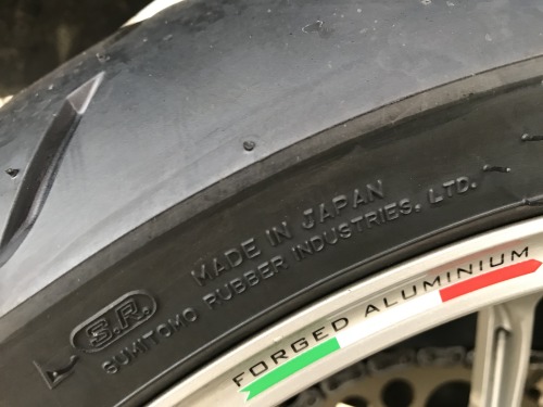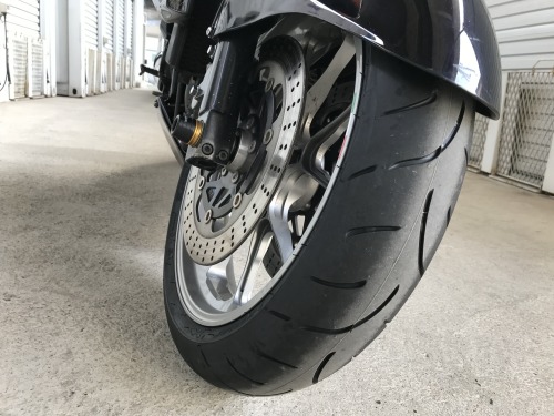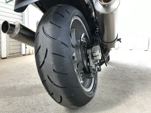 T工場長曰く、乗り方にもよるが10,000km持つ隼ユーザーもいるらしい。ハンドリングやグリップも「これで充分」と満足してリピーターになっているとの事。それってパワー5がいいな、と思っていたスペックと同じではないか。ハイグリップに戻すリスクも前後合わせて半額2万5千円だったら失敗しても痛くはない。 一瞬考えて 「こちらにします!」 左右対称の格好良さもコスパの前には(笑)。