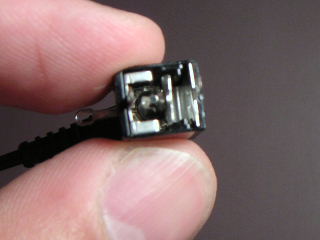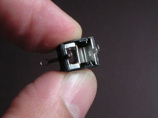 イヤホン端子は「パーツランド」で1個40円で売っていたもの。この端子を使って普段はスピーカーから警告音を出し、イヤホンを差し込んだ時はスピーカー音がキャンセルされてイヤホンから警告音が聞けるようになる。 凹部分とL型部分とがスイッチになっている(↓の写真)。 イヤホンピンを差し込む事によってこの部分の接触を切る事によって、スピーカー回路を遮断してイヤホンから音が出るようにするようだ(おそらく)。