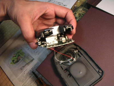 WX−10の蓋を開けた状態。基盤を見る事はできたが、肝心のイヤホン端子を取り付けている回路は表側にある。基盤を外そうとするがうまくいかない。 仮に今回の改造が失敗したらまだまだこのレーダーに頑張ってもらわないといけないので、無理はできない。 これ以上の確認を断念。 | |
