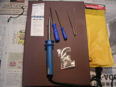 「パーツランド」で購入したはんだごてセット。 はんだごてとはんだ、ピンセットとドライヤーがセットになっていて1500円程。 | |