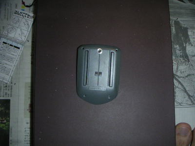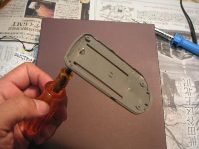 SRM−24の裏蓋で実験してみる。はんだごてを暖めた後、目標を定めてゆっくり差し込んでゆく。プラスチックが溶けて結構綺麗な穴が開いた。 その後ドライバーでグリグリ穴を広げていく。 | |