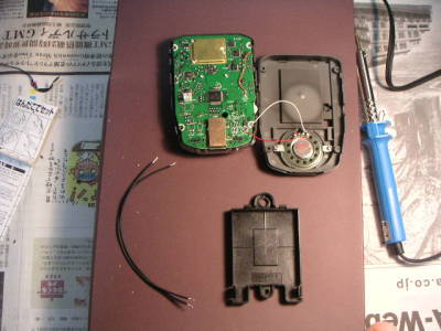 取り敢えず基盤側の配線をはんだづけし終わった。 慣れないはんだづけには結構緊張した。本当はピンポイントで取り付ければいいのだろうが、それがうまくできなくて山盛りはんだを盛ったので観てくれはとっても不恰好。 ちなみに配線を取り付けるのには、はんだごてセットにつしていたピンセットが重宝した。 この段階で+配線と−A配線を接触させた状態で警告音を鳴らしてみてちゃんと音がでる事を確認。これで一応基盤側の作業は終了。 |