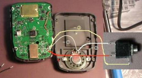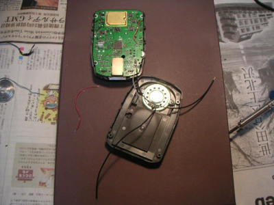 電池ケースにイヤホン端子を取り付ける。 はんだごてで穴を開ける練習はしていたが、今回の場合は本体と電池ケースの境目に取り付けるので少し難しかった。 取り付けたイヤホン端子に裏蓋から通してきた配線を接続する。全部接続できたところで充電池を取り付けて確認してみる。 電源オンしたところで警告音を鳴らしてみる。スピーカーからはちゃんと音が出た。次にイヤホン端子にイヤホンピンを差し込んでみる。ところが、スピーカーからの音はキャンセルさせているのだが肝心のイヤホンでも音が聞けない。 一瞬焦ったが、取付位置を変えたら今度はちゃんとイヤホンでも音を聞く事ができた。 一応配線にはマーカーで目印はしていたのだが、作業中に見えにくくなってしまっていた。 |