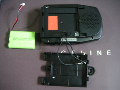 S−612Bは充電池は本体内部ではなく、裏蓋の下に専用の電池ケースで取り付ける構造になっている。 最初購入して箱から取り出した時「格好悪いなあ」と思ったが、よくよく考えると電池が劣化した時に簡単に交換できるし、何よりイヤホン端子を取り付けるには充分すぎるくらいのスペースがあって改造には非常に好都合。 更にありがたい事に、S−612Bには裏蓋に1箇所、電池ケース側通じる穴があいている。そこに取り付けた配線を電池ケース側に通す。 右側の緑色のものが充電池。 |