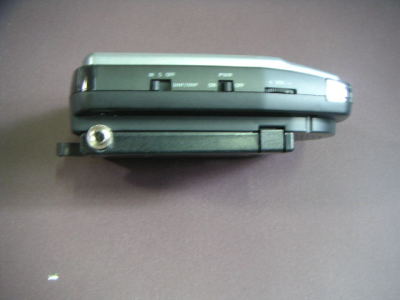 WX−10。バイク用に改造されている。電気技師の先輩がスピーカーの配線を切ってイヤホンを繋いでいる。裏面の4箇所を抜くと蓋があく。 | |