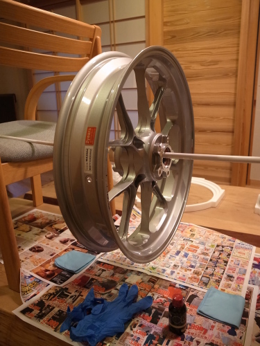 事前に「山城」から、ホイールは回転させながら施工すればやり易い、と聞いていた。さてどうするか? 考えた末に編み出した方法が、椅子2脚の間に突っ張り棒を置きそれにホイールをセットして施工する方法。単純な発想だったが、これが大成功。 ホイールの重さで突っ張り棒がグラグラする事無く、ホイールを回転させながら塗り進め、ふきとっていくのが楽だった。 |