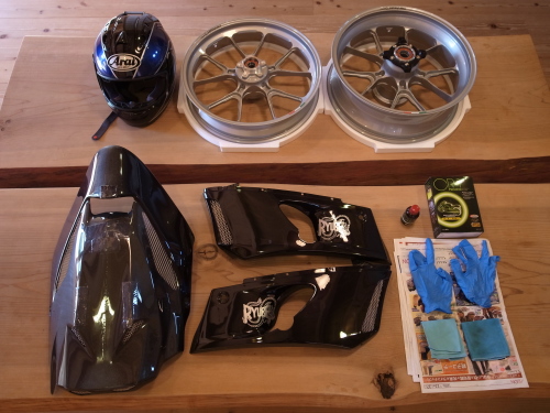 今回施工したパーツ。ホイール2本、ヘルメット、ハーフカウル、アンダーカウル。ホイールが主目的だが、油汚れがつき易いハーフカウルとアンダーカウルも併せて施工する事にした。ハーフカウルは今回の整備期間中に赤男爵店に”龍ベー”ステッカーを貼付しクリアを再塗装して貰ったので塗装面は新品同様。