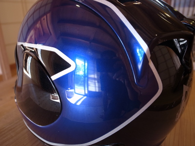 ヘルメット、ハーフカウルは色が濃いので虹色に変わるのが判りタイミングが掴み易かった。 施工後表面が綺麗に反射するようになった、気がする。 |