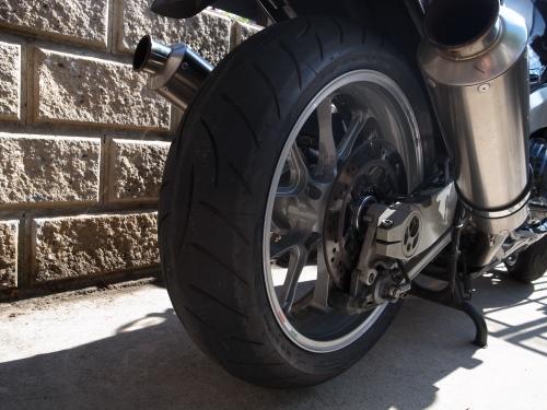 土曜日に赤男爵店・T工場長にZX-11を預けて、その日の夜までに交換作業が完了。次の日早速ZX-11を引き取りに行く。一目観て大満足。純正ホイールと同じシルバー色なので一見目立たないが、M10SのシンプルなデザインはZX-11とピッタリ!