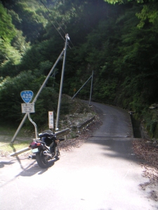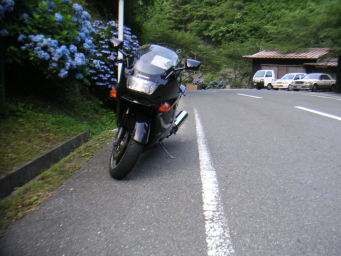 国道425号線に入ってすぐに、私の見込みが大きな間違いであった事を思い知らされる。 道はどんどん細くなり、低速というよりも極低速コーナーの連続。道は舗装しているものの、砂利が浮きまくっていてまともに走れない。 これは国道ではなく、林道と言った方が良い道だ。 もう必死である。 おまけに「国道169号線まで25km」とかいう表示。 地図で見た直線距離は高度を考慮していなかった。 泣きたくなりながら、重たいZX−11を右に左に・・・。 もうコーナリングがどうこう言っている状況ではない。 | |