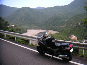 谷瀬の吊り橋まではあっという間に到着。 ここで少し欲が出る。このペースだったら国道168号を更に南下して国道169号に折り返しても楽勝で大阪に戻れるのでは? と考えた。 マッハVでゆっくりコーヒーを飲んで、昼前に帰れば良いと思い地図でチェック。位置としては手頃な国道425号線を使って国道169号に抜ける事にする。一瞬、昔Tが「この道はかなり細いから避けた方が良い」と言っていたのを思い出したが、ツーリングマップルで見ればせいぜい15km程の距離。 これならば少しの我慢で行けるやと判断。後にこれが非常に甘い見込みであった事を思い知る。 |