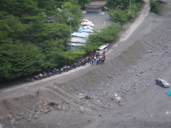 谷瀬の吊り橋から下を眺める。 丁度どこかのツーリングクラブが出発前のミーティングをしていた。それにしても凄い台数。 | |
