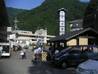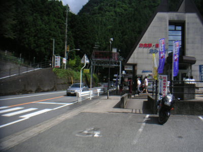 道の駅「十津川郷」。ここには足湯がある(←写真看板手前の屋根の下)。この時点でも8時前。 国道425号を抜けるのに1時間としても、11時には余裕で大阪に戻れる、という計算をしていた。 |
