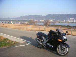 和歌山市に、私の公私に渡る師匠がお住まいで、その師匠に届け物がありZX−11で往復した。 出発は寝坊して7時。その為コースは最短距離である泉北経由での阪和自動車道利用になった。 朝7時で日は明けてきていたが、路面は濡れているのでペースも程々に走る。幸い信号で引っ掛かる事もほとんどないコースの為、50分程で和歌山市内到着。 少し時間があったので紀ノ川の堤防まで出て一休みする。 快晴の中見晴らしが良く気持ちが良かった。