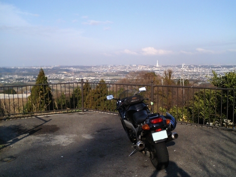 冷えた路面状況が苦手な私は無理をせず、追い越しもせずに景色を眺めながら南に走る。南阪奈道路をくぐり、適度なワインディングをゆっくり楽しみながら走っていると展望の良いパーキングを発見(上の写真)。 ウグイスが盛んに鳴いているのを聞きながら遠く富田林市の街並みとPLの塔を眺めていた。