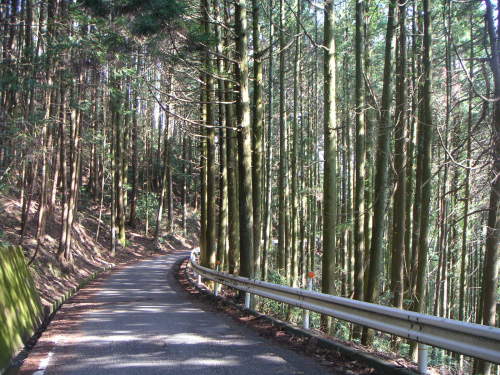 国道480号は和歌山方面は気持ちの良い山道。路面も展望悪くなくて遠く葛城山や三国山を眺めながらトコトコ登っていく。ところどころある林の中には朝日が差して幻想的な景色が広がっていた(下の写真)。